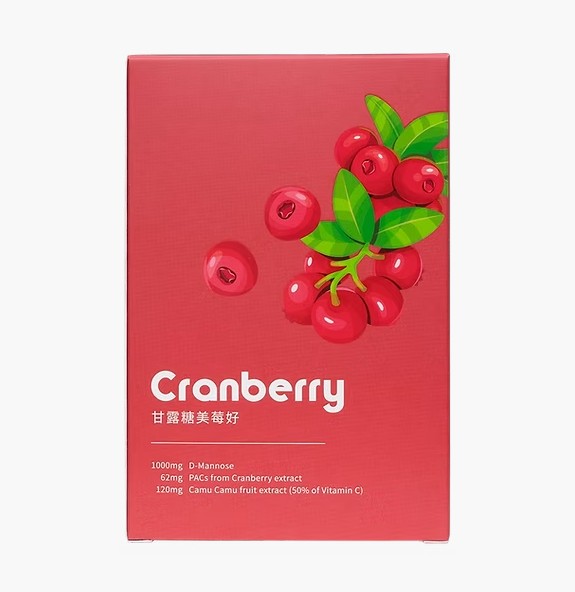 - 成分:甘露糖、蔓越莓萃取Crantiva™、玉米來源可溶性纖維、卡姆果粉(維生素C、麥芽糊精、卡姆果粉)、蔓越莓萃取Exocyan™(蔓越莓萃取、麥芽糊精)、二氧化矽