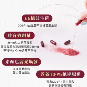 - 內容物成分蔓越莓萃取、玉米澱粉、乳酸菌粉(嗜酸乳酸桿菌Lactobacillus acidophilus、玉米澱粉、海藻糖、綜合莓果萃取物(葡萄、野藍莓、覆盆莓、蔓越莓、加州梅、酸櫻桃、山桑子、草莓、二氧化矽)、酵母粉(含維生素B1、維生素B2、本多酸鈣、維生素B6、生物素、葉酸)、奧勒岡草萃取、果寡糖、番石榴葉多酚、二氧化矽。膠囊成份:明膠、純水、甘油、硫酸月桂酯鈉、食用紅色六號New Coccin、食用紅色七號(Erythrosine、食用藍色一號(Brilliant Blue FCF)